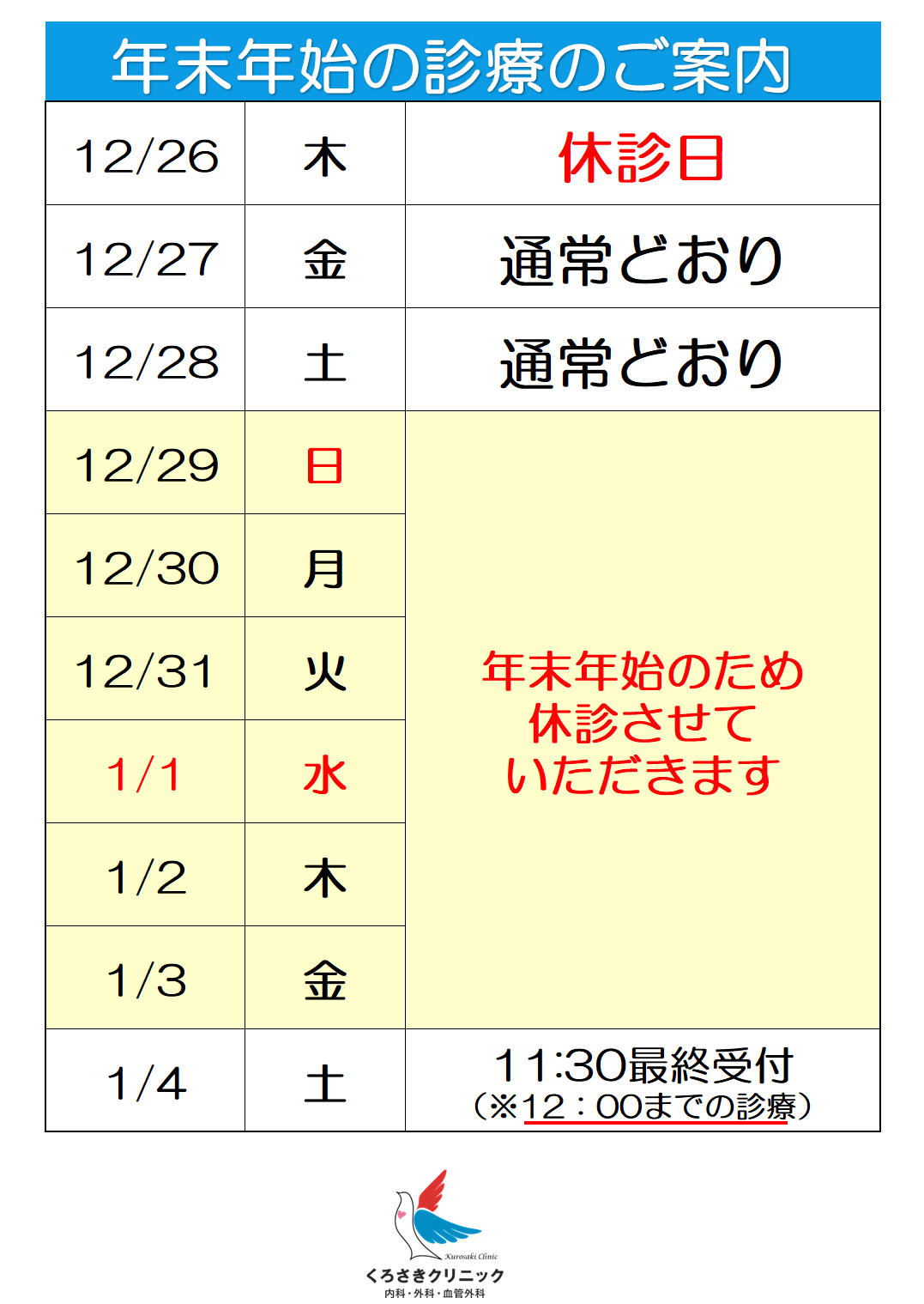 9/27(土)診察時間変更・9/29(月)臨時休診のお知らせ 【7/19(土)臨時休診のお知らせ】https://www.kurosaki-clinic.jp/blog/7-19/【お盆休みのお知らせ】https://www.kurosaki-clinic.jp/blog/3050/ 2025.07.16 category : クリニックからのお知らせ